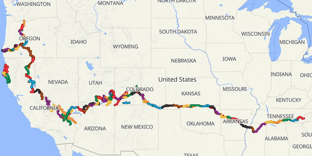 My plan for riding my new bike across the United States starts on the Blue Ridge Parkway which is just 1/2 mile from where I live in Asheville. I connect up with the Trans Am Trail‍ ‍in Cherokee, NC and I am on the TAT as I go cross country. It’s a popular route! My route crosses 11 states, covers 5,000 miles, and ends up in Portland, Oregon. In California, I leave the TAT and take Backcountry Discovery Routes through the Sierra Nevada Mountains, and then jump across to the newly released GPX Lost Coast Route that runs along the Pacific.